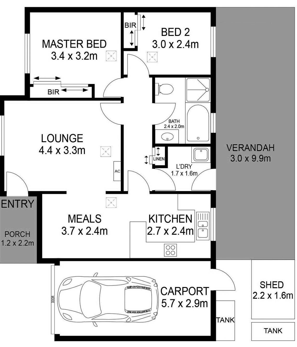 A light-filled lounge sits at the front of the home, offering separation of living. There is a laundry with external access and linen closet to complete the floorplan.  A garden shed offers extra storage space, while two water tanks supply rainwater to keep bills low.